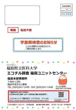 「エコチル調査☆ふくしま」ホームページは、令和3年3月末にリニューアルしURLが変更となったため、送付資料に印刷されている旧サイトQRコード・URLからは、直接「学童期検査」ページにはつながらない状態になりました(「エコチル調査☆ふくしま」ホームページにはリンクします)。