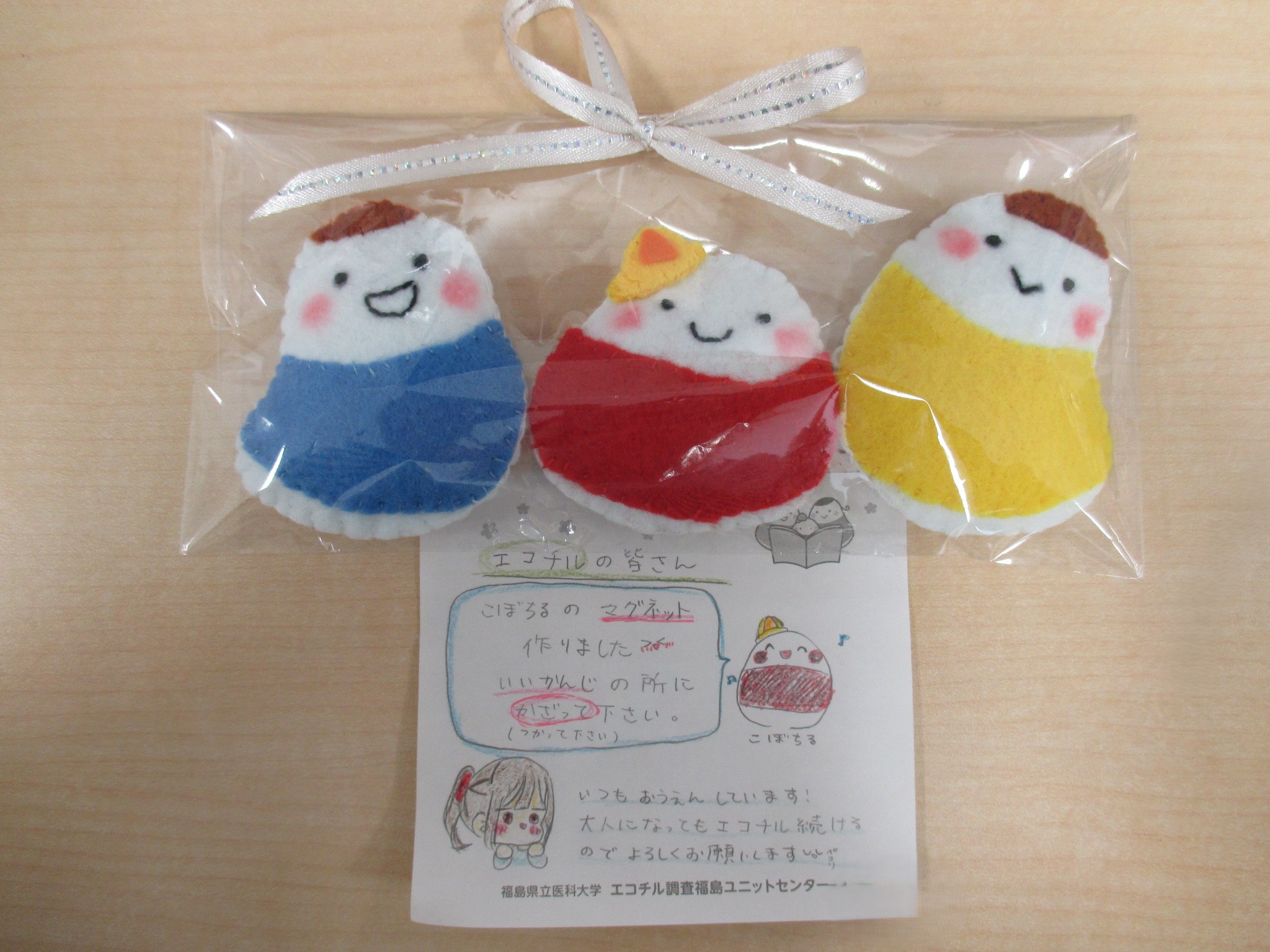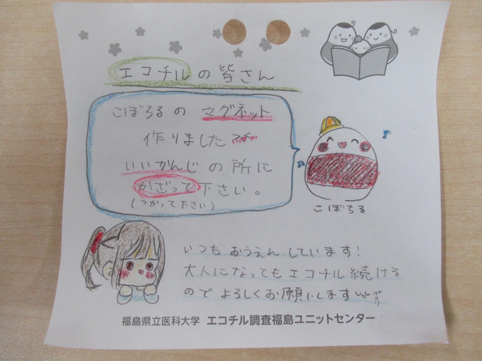 参加者さまから手作りのこぼちるファミリーマグネットとお手紙が届きました♪ 2025年10月28日お知らせ いつもエコチル調査にご協力いただき、ありがとうございます。 参加者さまから、手作りのこぼちるファミリーマグネットとお手紙が届きました✨ クオリティの高さに驚き、スタッフ一同とても喜んでおります🎵 素敵な作品をありがとうございます😊 13歳以降も、エコチル調査は継続していますので、今後ともエコチル調査にご協力をお願いいたします。